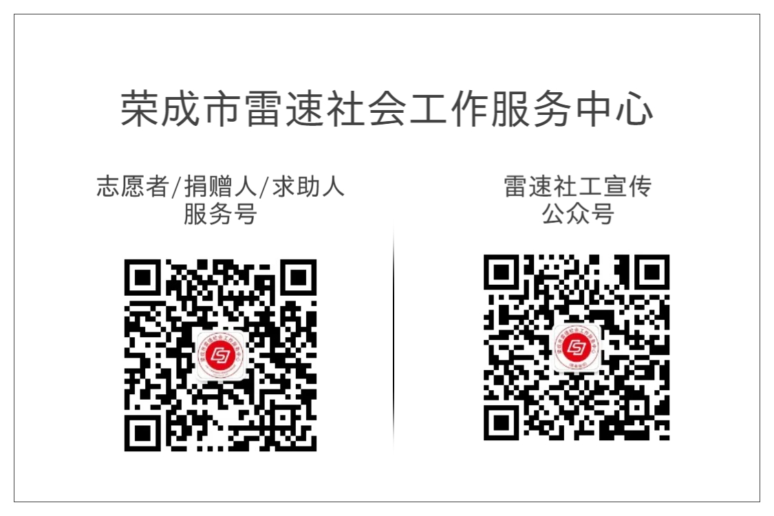 荣成市雷速社会工作服务中心于2023年7月13日登记,业务主管部门是荣成市民政局。自成立以来,以通过公益行为,帮助弱势群体,推动社会公平正义为使命的一家非营利性社会组织。该中心的主要工作方向是为老人,儿童、特殊群体提供专业服务,先后开展过公益理发,便民维修,文艺表演,爱心义诊,助老爱心餐,周末小课堂等公益活动。主要项目:《关爱老人 雷速相伴》助老志愿项目,《崇孝尚礼 文明同行》移风易俗项目,《一路童行》关爱困难儿童。《生命之光》助困救助项目。 2024年3月被威海市授予“全市最佳志愿服务组织”称号。